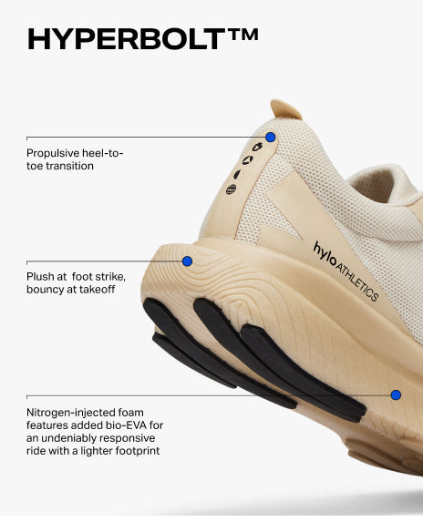 • Midsole: Hyperbolt™ supercritical nitrogen-injected foam with added bio-EVA for more cushion at foot strike and bounce at takeoff. PureGlide™ geometry for a smooth, stable, propulsive heel-to-toe transition.
